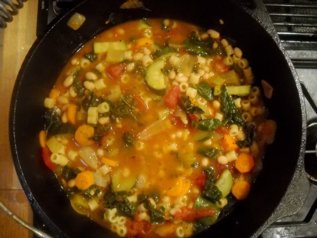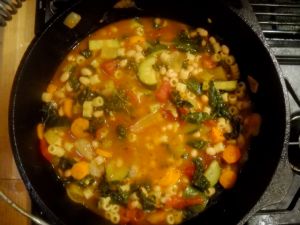 Heat a Dutch oven over medium heat with the olive oil. Add the onions once it’s warm and saute for 2 minutes then add the minced garlic and stir constantly for 60 seconds. Add the carrot, celery, zucchini, potato, basil, diced tomatoes and vegetable broth. Stir the soup, mixing everything together, then season with sea salt and black pepper. Simmer on medium low heat for 45-60 minutes (depending on how soft you like your veggies). Add the Kale, corn, and beans, taste and re-season if needed. Cook for an additional 5 minutes. Enjoy!